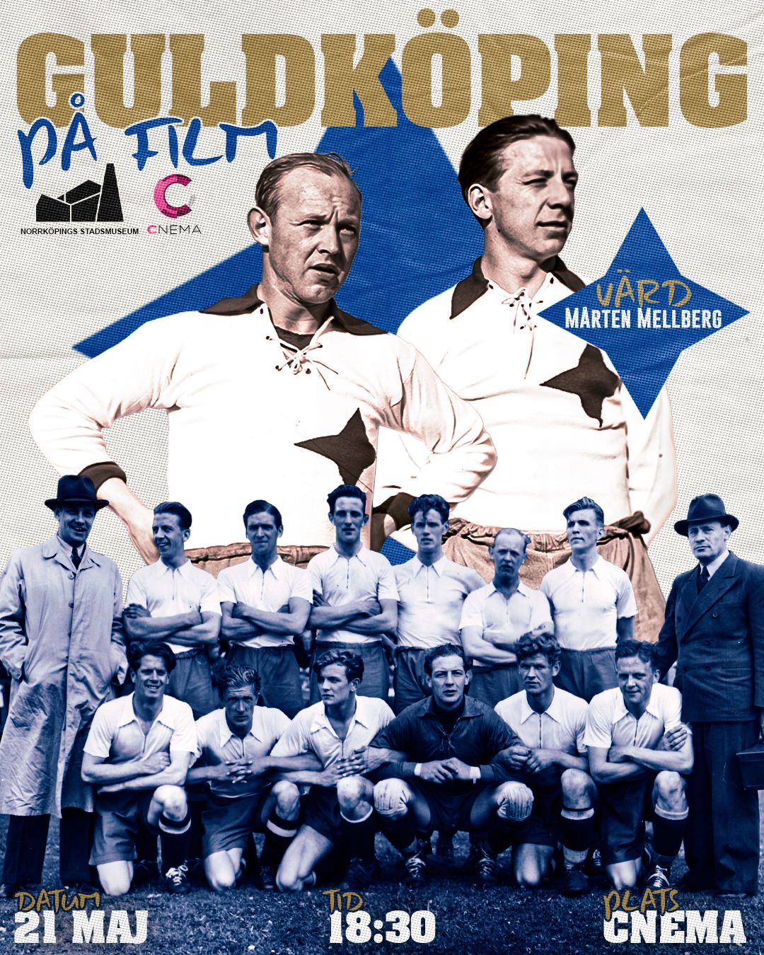 Under Guldköping på film visas nu arkivfilmer från denna klassiska period, material som till stora delar aldrig tidigare visats för allmänheten. Kvällens värd är Mårten Mellberg, skaparen av historieprojektet 125 IFK:are, som guidar publiken genom epokens händelser, profiler och betydelse.