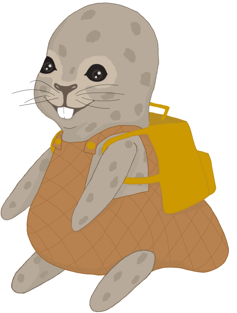 Vår maskot ”Bäversälen” som upptäcker museets olika rum, utställningar och föremål på ett lekfullt sätt tillsammans med våra yngsta besökare.